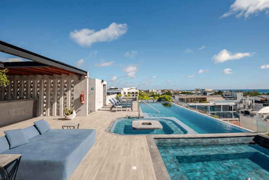 Este departamento de 1 recámara en El Volta Playa del Carmen Centro cuenta con excelentes amenidades: recepción, regadera terapéutica, gimnasio, espacio de coworking, seguridad 24/7, bar en el rooftop, bar en la alberca, jacuzzi y asoleaderos. Ubicado en